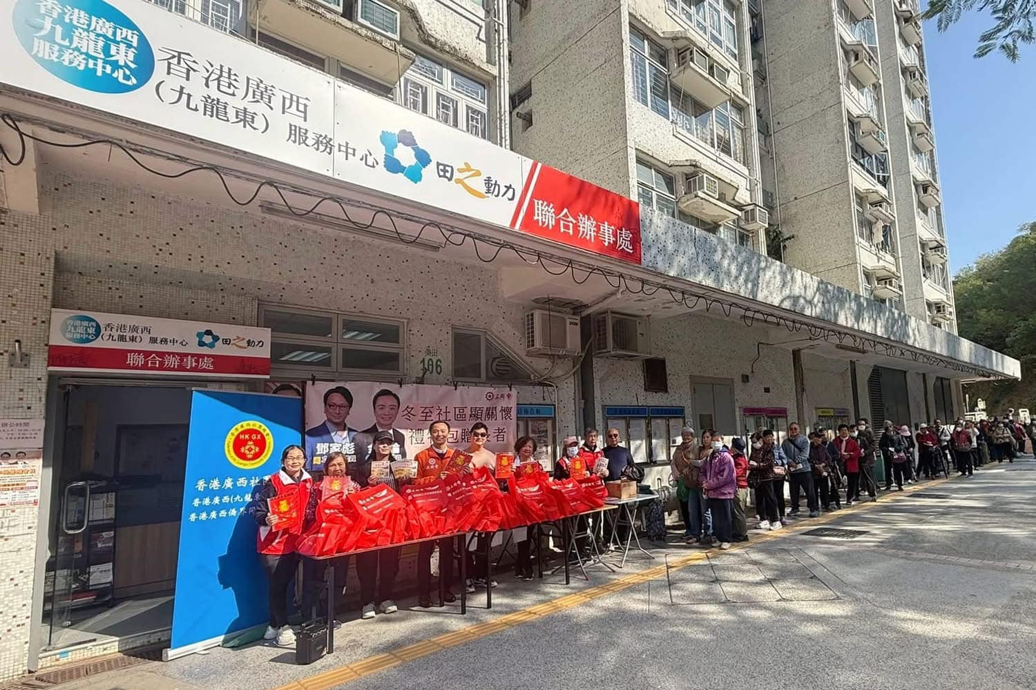 12月21日,香港廣西九龍東服務中心舉辦《冬至社區顯關懷》,向藍田興田邨及康華苑的老友記送上愛心禮物包,加上義工親手編織的頸巾和冷帽,和大家同度一個有溫度的冬至,將溫暖傳社區,與市民同慶團圓。