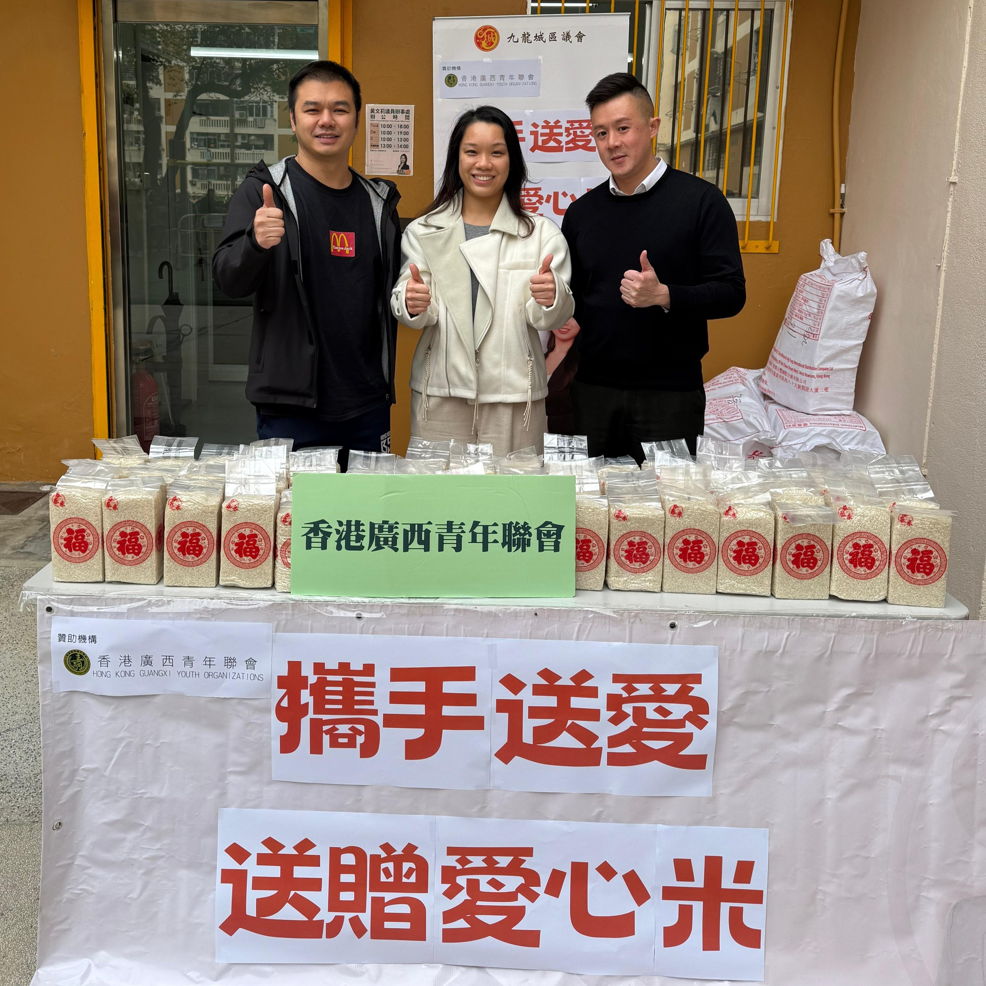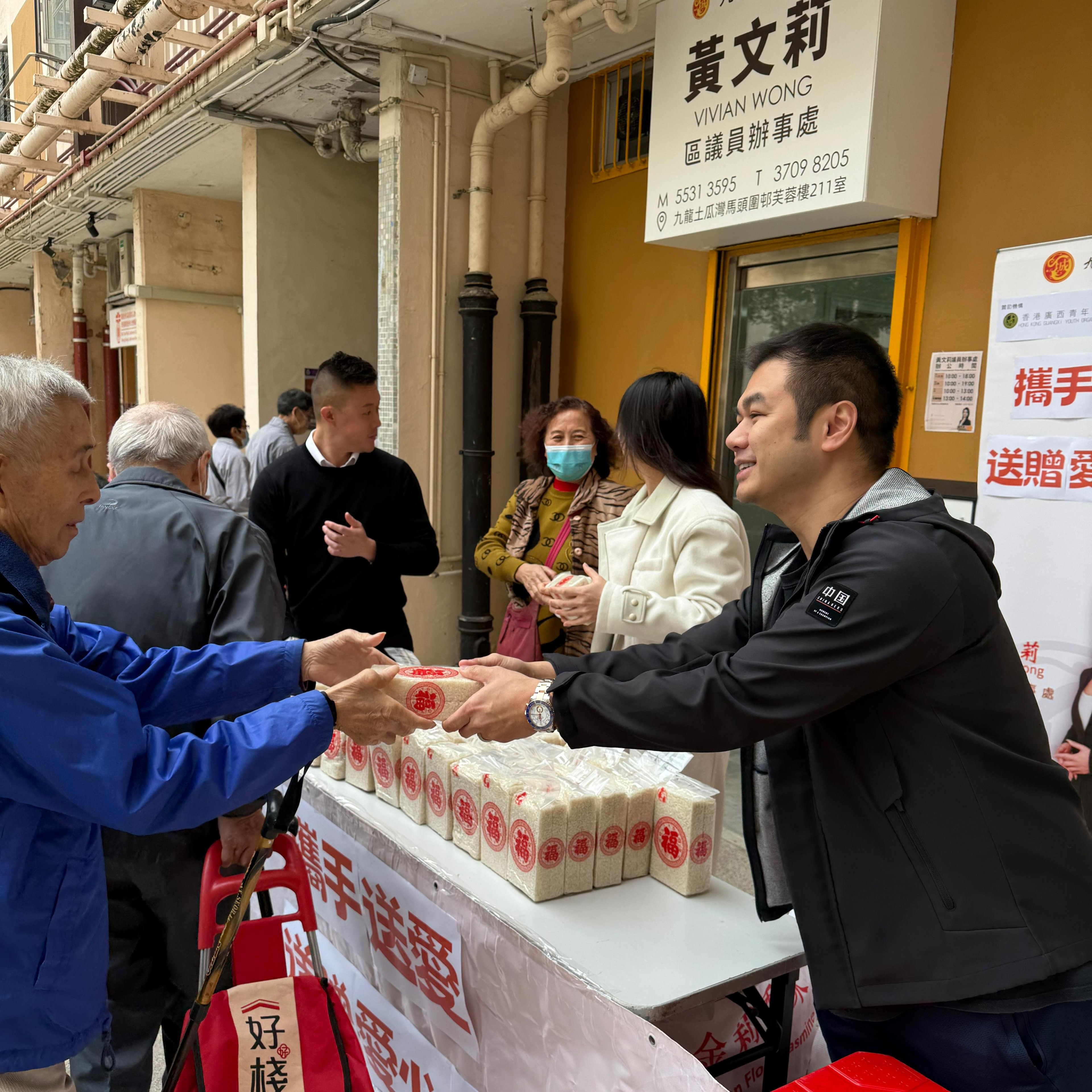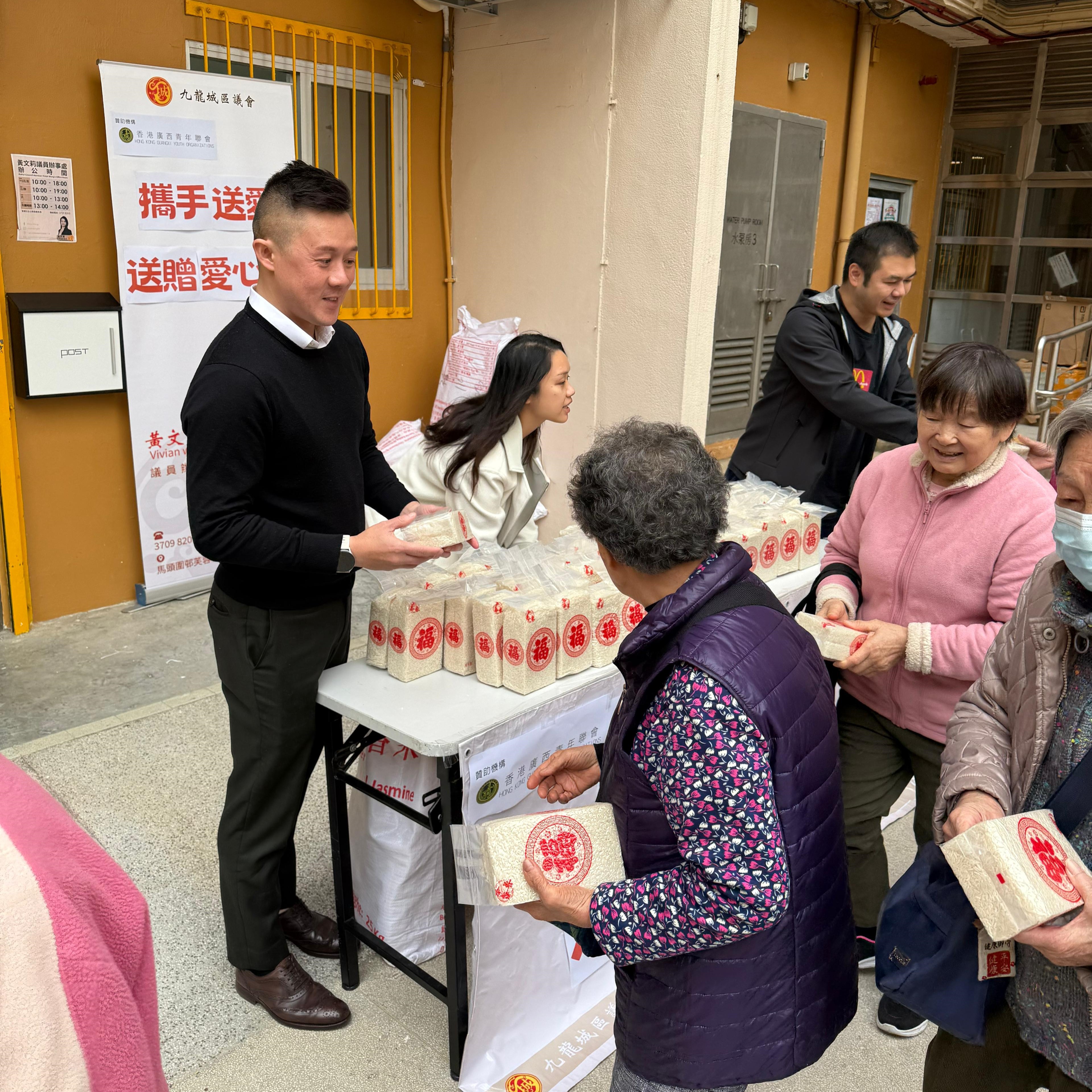 香港廣西青年聯會與香港廣西九龍中服務中心聯同九龍城區議員黃文莉於1月7日合辦《攜手送愛 送贈愛心米》活動,為馬頭圍邨的長者送上500多包愛心福米。一眾架構成員及青年義工更一起上門探訪長者,送上問候與關懷。