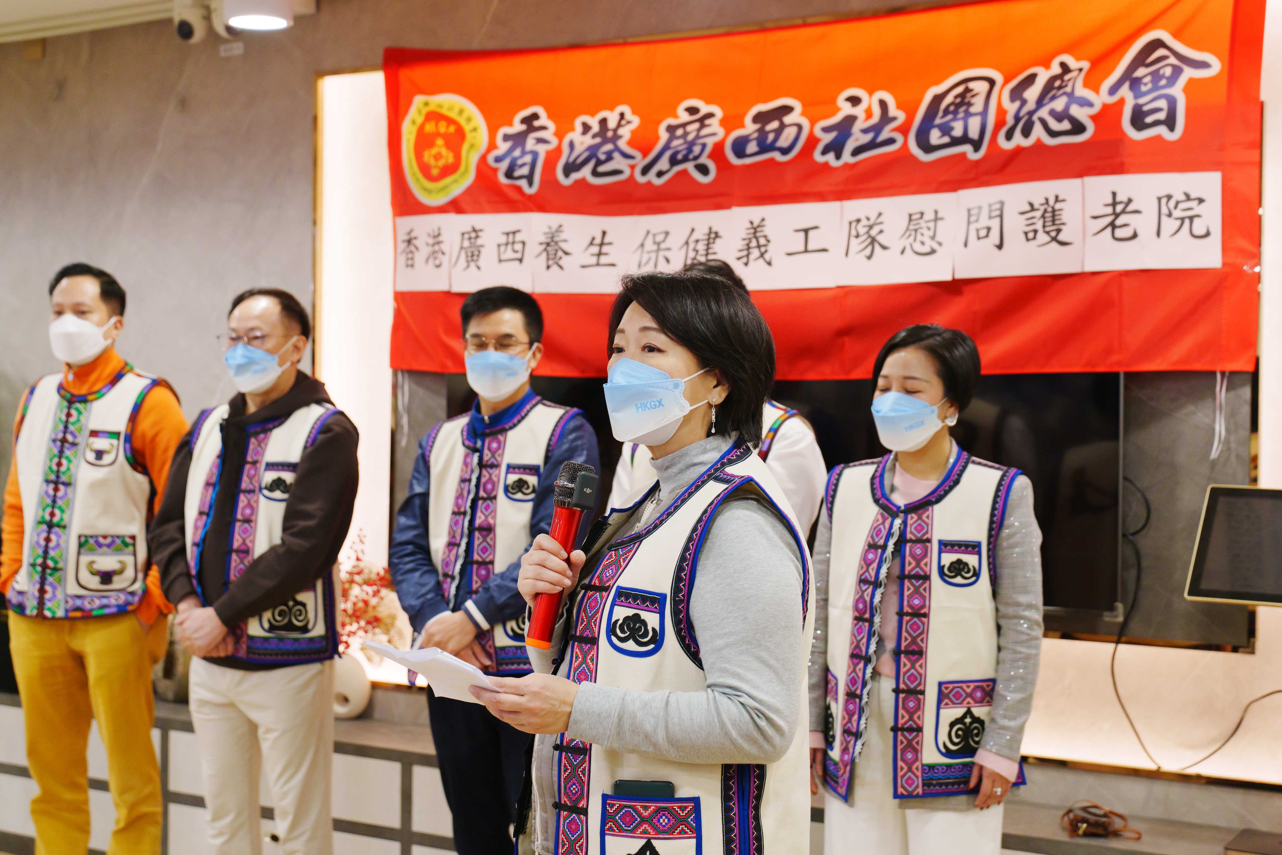 香港廣西社團總會會長文頴怡致詞表示:現時全國接近90個「長壽之鄉」中廣西佔了差不多三分之一,河池市巴馬縣更加被稱為「世界長壽之鄉」,原因除了當地自然、優美的地理環境外,還結合了中醫、壯族、瑤族這些少數民族的醫藥保健方法。香港廣西社團總會組織了一群熱心義工去到廣西中醫藥大學接受廣西中醫的外科治療手法培訓,畢業後正式獲頒保健按摩師、保健調理師的技能證書。感謝一眾畢業學員響應號召加入「香港廣西養生保健義工隊」並在義工隊張文廸隊長的帶領下開展慰問護老院的行動,為護老院長者進行保健按摩。「香港廣西養生保健義工隊」日後亦會將服務逐步擴展至全港的護老機構,為社區服務。