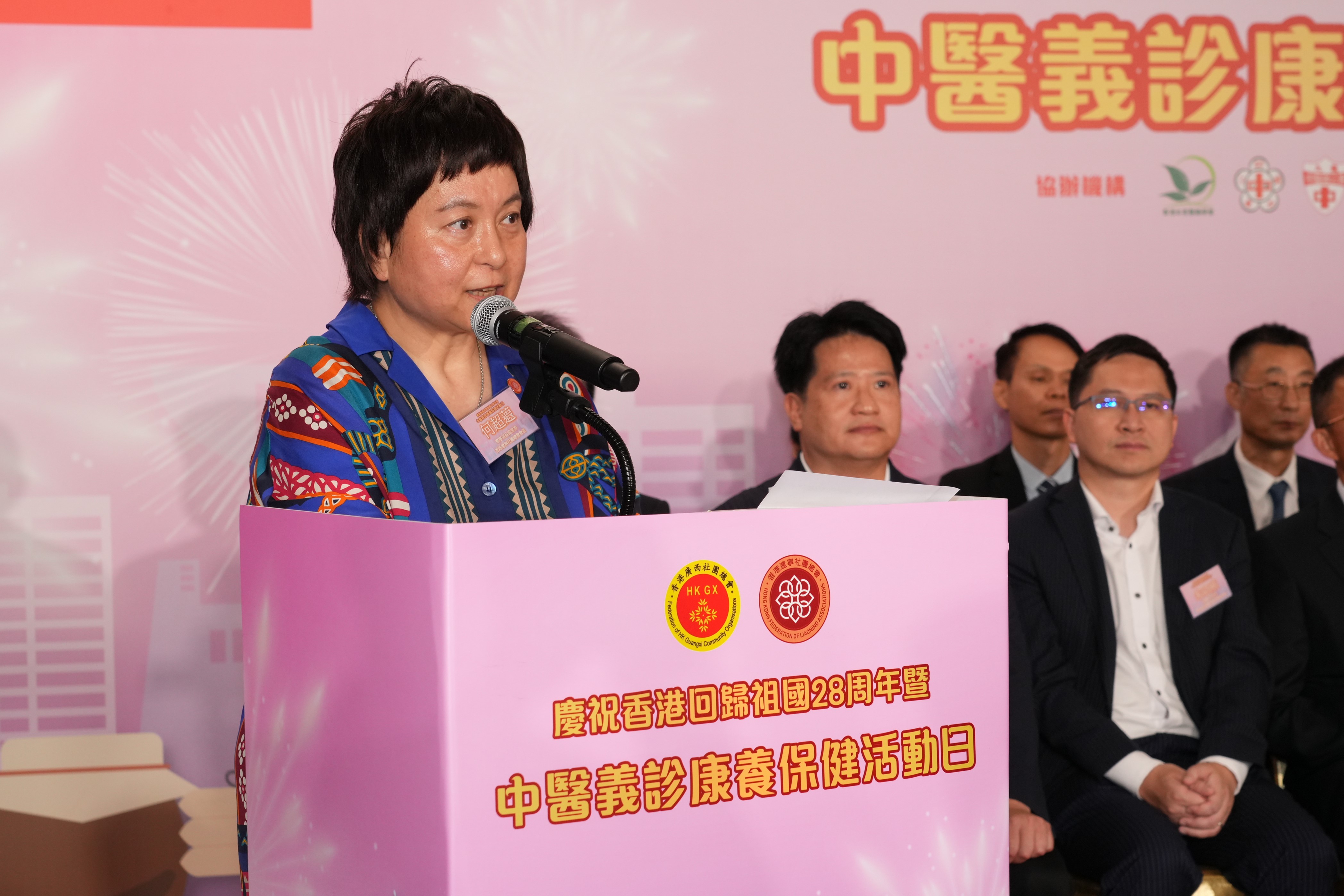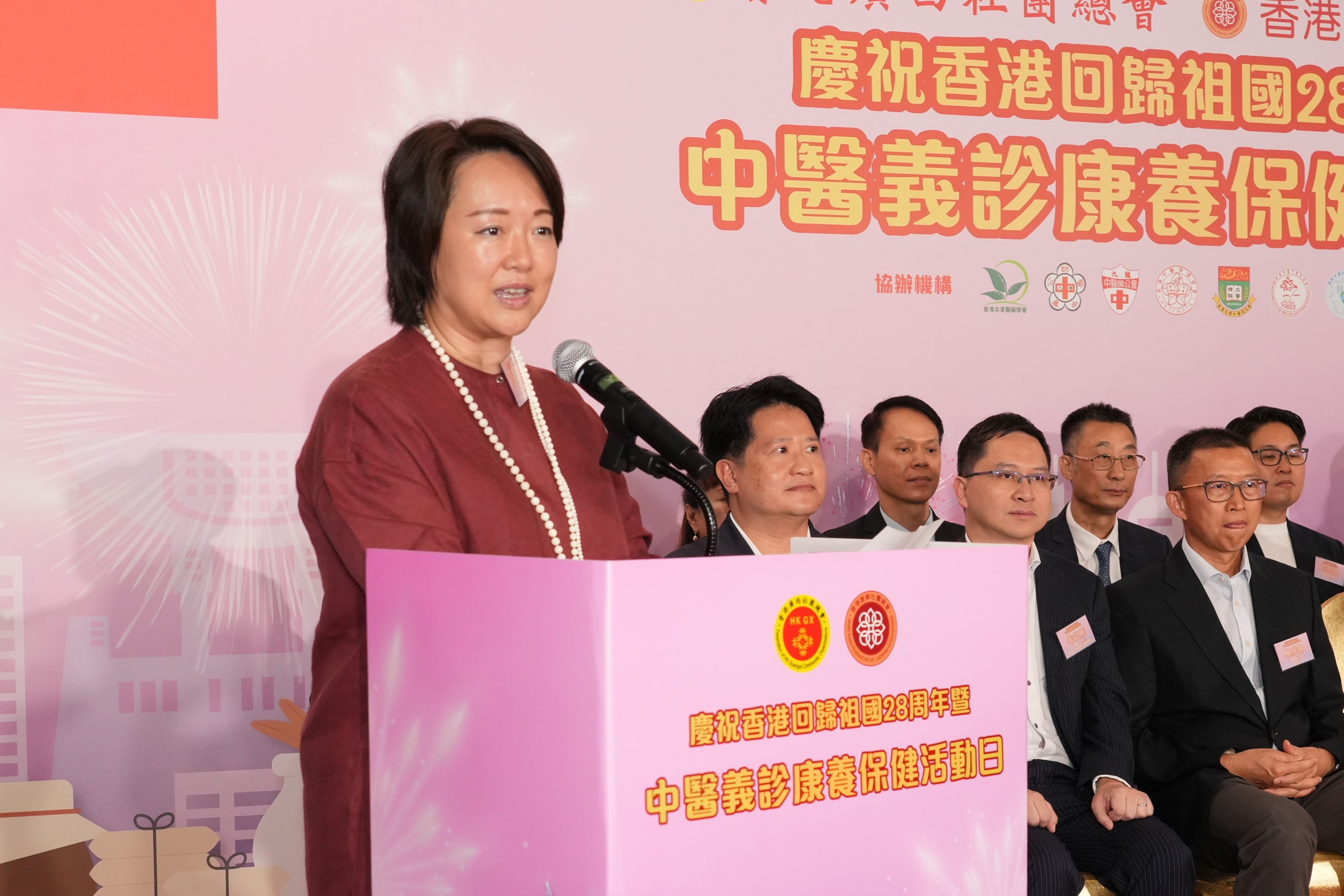 遼寧省政協常委、香港遼寧社團總會會長何超蕸女士致辭表示香港回歸祖國28周年,在「一國兩制」的偉大實踐下,為香港的長期繁榮穩定築起最佳制度的保障,讓紫荊花綻放艷麗光芒,續寫新時代香江傳奇。在祖國堅定支持下,香港成為全球三大國際金融中心之一,迎來更多新發展機遇,可喜可賀。透過這個充滿關愛的活動來慶祝香港回歸祖國28周年,既展現我們愛國的情操及對中華傳統醫學的重視,又對特區政府倡議全民健康理念的積極回應,以「愛國愛港」的情懷化作惠民樂民的行動。她還提及今次的活動有超過300位醫師、保健義工及市民聚首一堂參與活動,正正反映政府、社會各界及大眾市民對社團工作的高度肯定與大力支持。