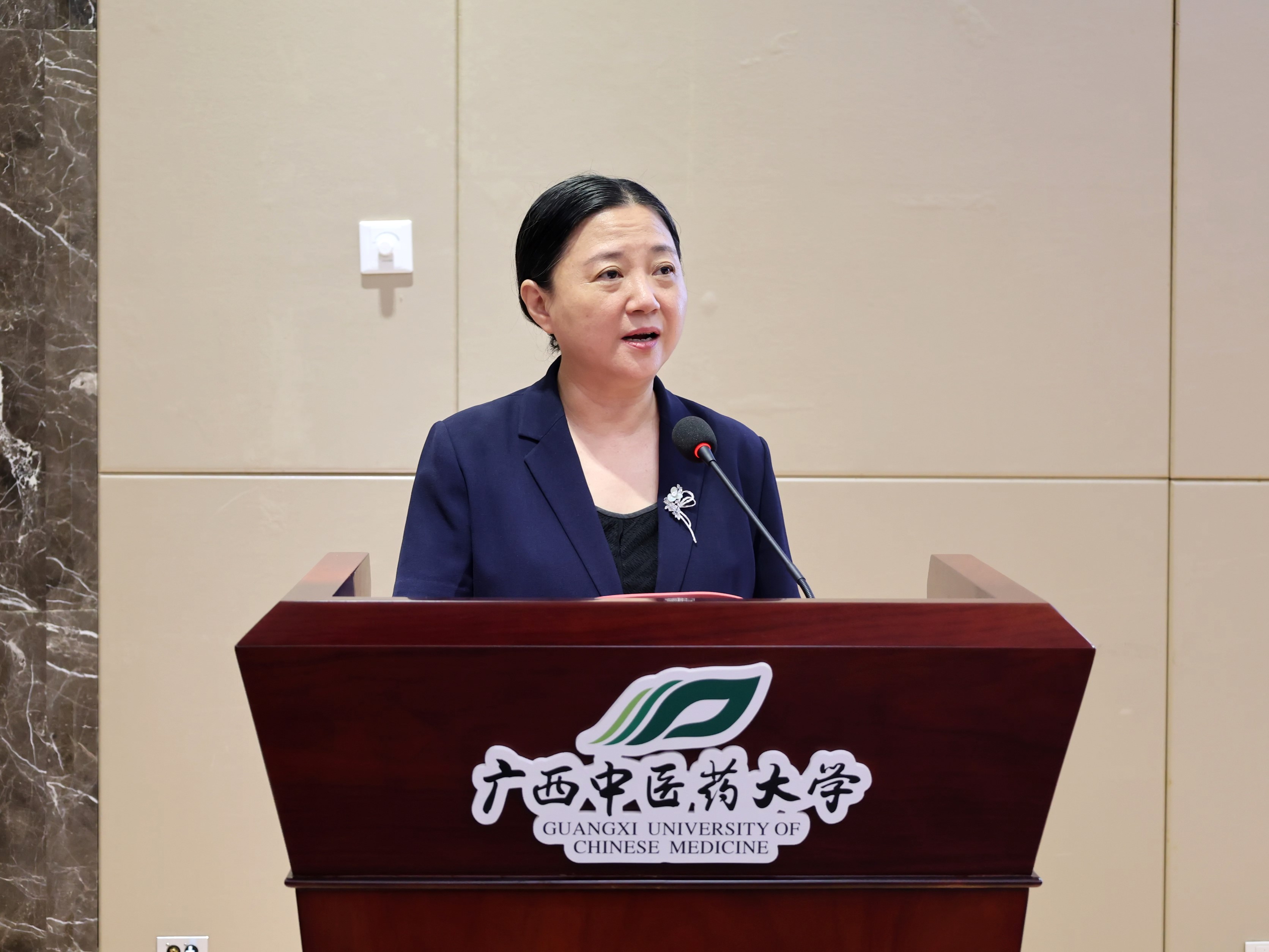 廣西中醫藥大學校長姚春在儀式中介紹了學校的發展概況及其在國際交流合作方面的成果。她鼓勵學員把握學習機會,將所學知識與技能應用於香港社區服務,為更多有需要人士提供中醫保健服務。同時,她期望桂港雙方進一步加強溝通,建立常態化交流合作機制,將本計劃打造成為桂港中醫藥合作的重要品牌項目。