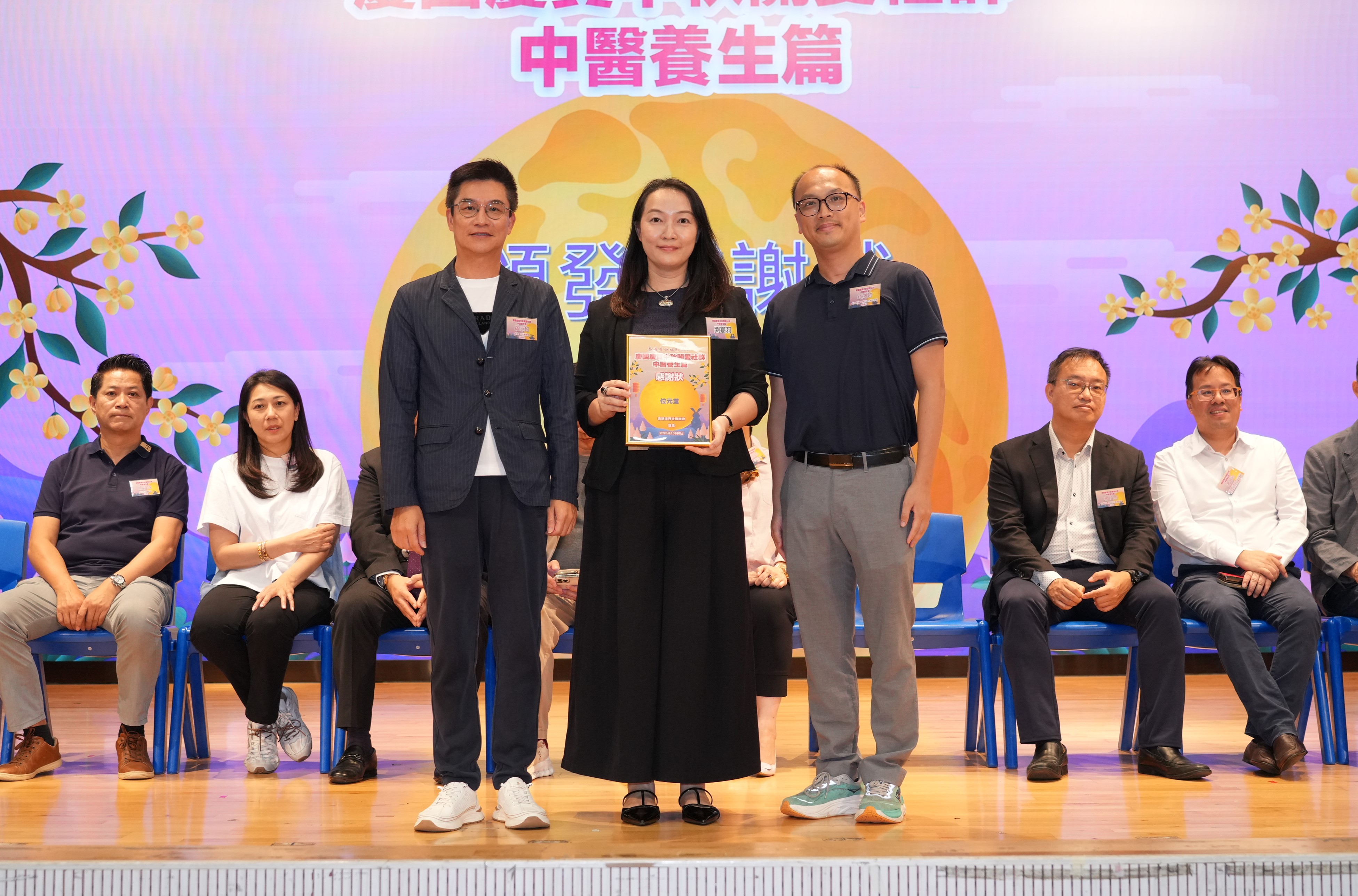 毛燕珊常務副會長陪同油尖旺區民政事務處民政事務專員余健強向協辦單位九龍中醫師公會贈送感謝狀。