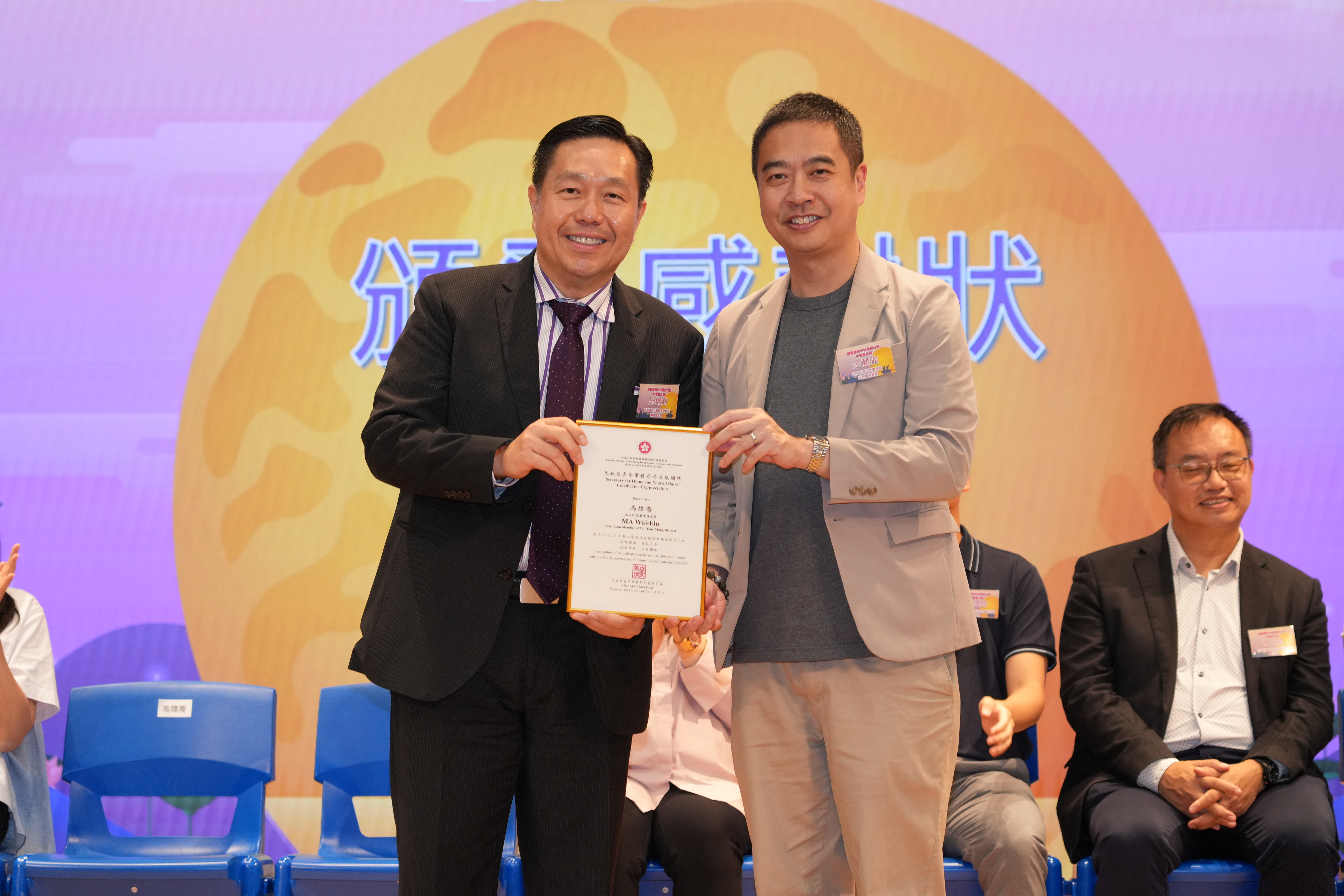 油尖旺區民政事務處民政事務專員余健強向馬煒喬副會長贈送感謝狀。